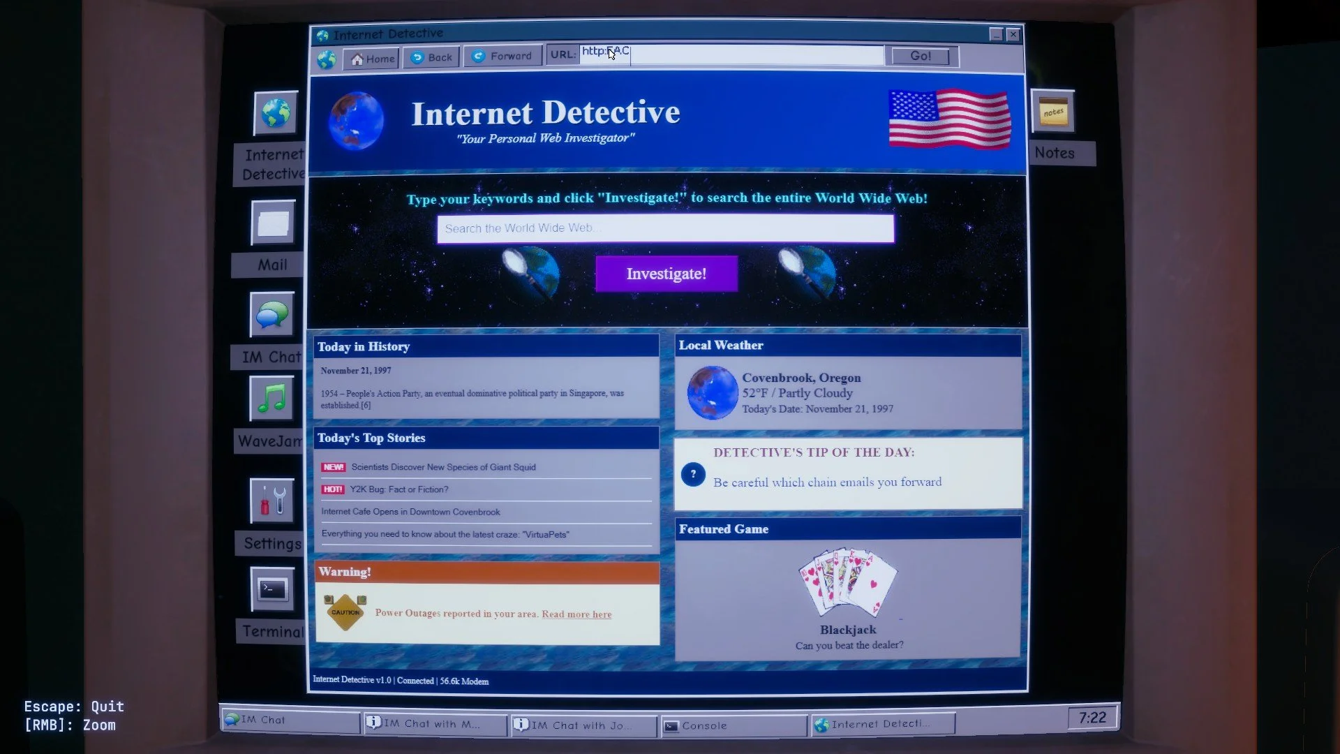 The kid-left-home-alone trope has been mined a few times recently, most notably in this Fears To Fathom episode. Secret of Suburbia’s developers have warped their version back to 1997, recreating an authentic late-Nineties internet experience alongside its dense, oppressive atmosphere.